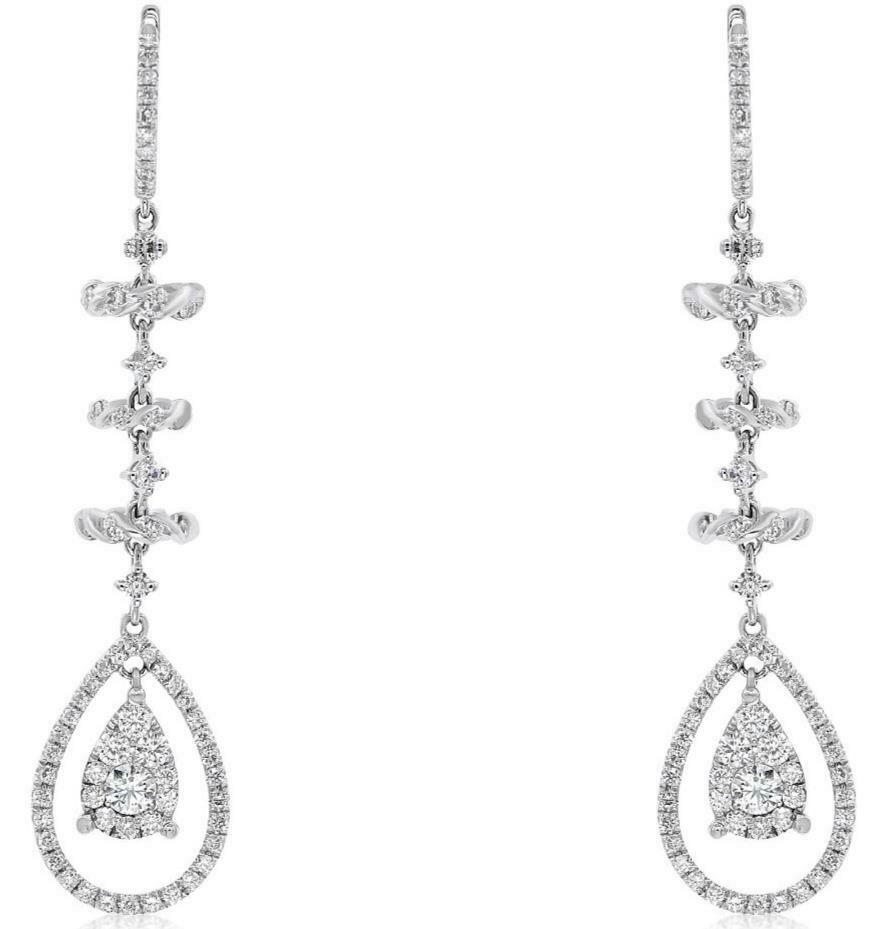 1.78CT DIAMOND 18KT WHITE GOLD 3D CLUSTER TEAR DROP FLOWER HANGING EARRINGS