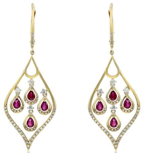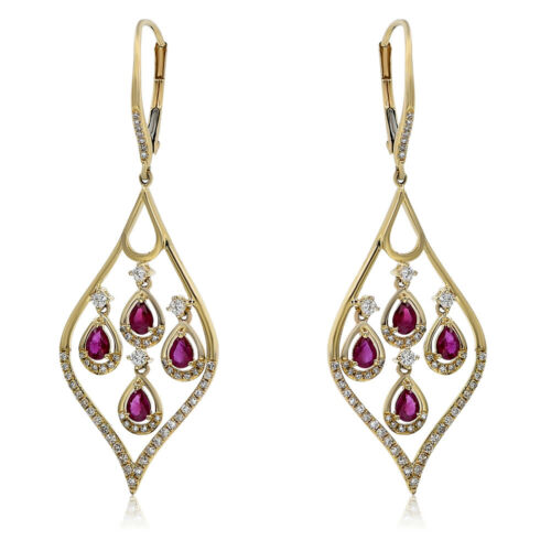 14KT YELLOW GOLD LEVERBACK HANGING EARRINGS. 3D TEAR DROP CHANDELIER DESIGN. ROUND DIAMONDS ARE F/G COLOR, VSSI CLARITY .66 CARATS. AAA RUBIES ARE 1.13 CARATS. WRITTEN APPRAISAL AVAILABLE. COMES IN A PRESENTABLE GIFT BOX.