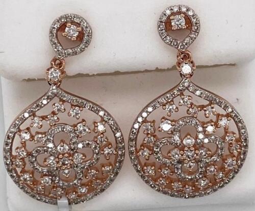 1.80CT DIAMOND 14K ROSE GOLD FLOWER OPEN FILIGREE TEAR DROP FUN HANGING EARRINGS