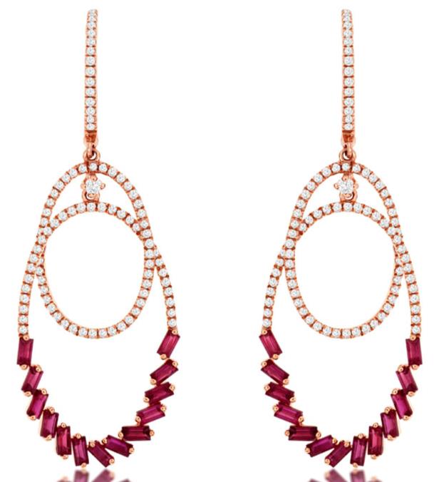 14KT ROSE GOLD EARRINGS. 3D CHANDELIER TEAR DROP DESIGN. ROUND AND OVAL DIAMONDS ARE F/G COLOR, VSSI CLARITY .55 CARATS. AAA BAGUETTE RUBIES ARE 1.25 CARATS. WRITTEN APPRAISAL AVAILABLE. COMES IN A PRESENTABLE GIFT BOX.
