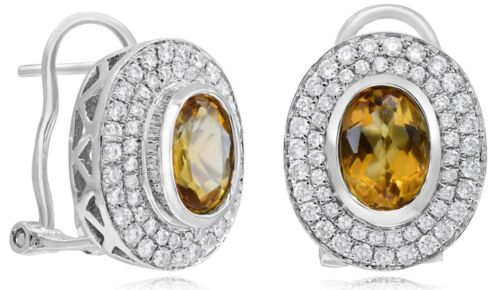 14KT WHITE GOLD CLIP ON EARRINGS. 3D DOUBLE HALO FLORAL DESIGN. ROUND DIAMONDS ARE F/G COLOR, VSSI CLARITY .52 CARATS. AAA OVAL CITRINES ARE 1.28 CARATS.