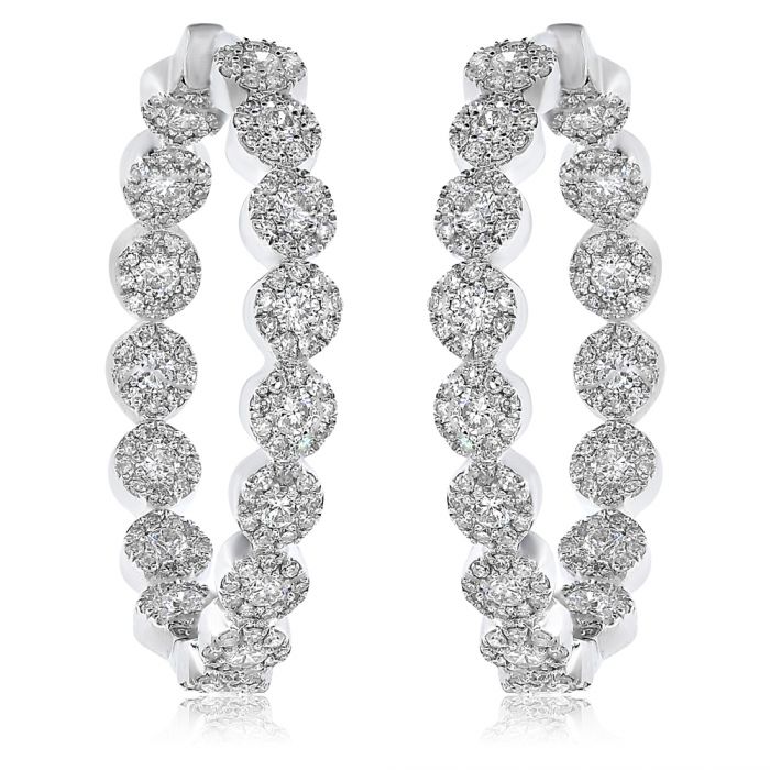 14KT WHITEGOLD HOOP HANGINGEARRINGS. 3D MULTI FLOWER CLASSIC INSIDE OUTDESIGN. DIAMONDS ARE F/G COLOR, VSSI CLARITY 1.81 CARATS. WRITTEN APPRAISAL AVAILABLE. COMES IN A PRESENTABLE GIFT BOX.
