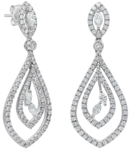 1.81CT DIAMOND 14KT WHITE GOLD ROUND & MARQUISE TEAR DROP LEAF HANGING EARRINGS