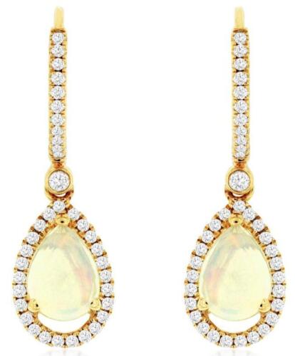 14KT YELLOW GOLD LEVERBACK HANGING EARRINGS. 3D CLASSIC HALO TEAR DROP DESIGN. ROUND DIAMONDS ARE F/G COLOR, VSSI CLARITY .42 CARATS. AAA PEAR SHAPE OPALS ARE 1.40 CARATS. WRITTEN APPRAISAL AVAILABLE. COMES IN A PRESENTABLE GIFT BOX.
