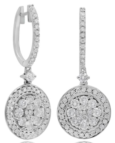 1.85CT DIAMOND 18K WHITE GOLD 3D CLUSTER FLOWER BEZEL HUGGIE HANGING EARRINGS