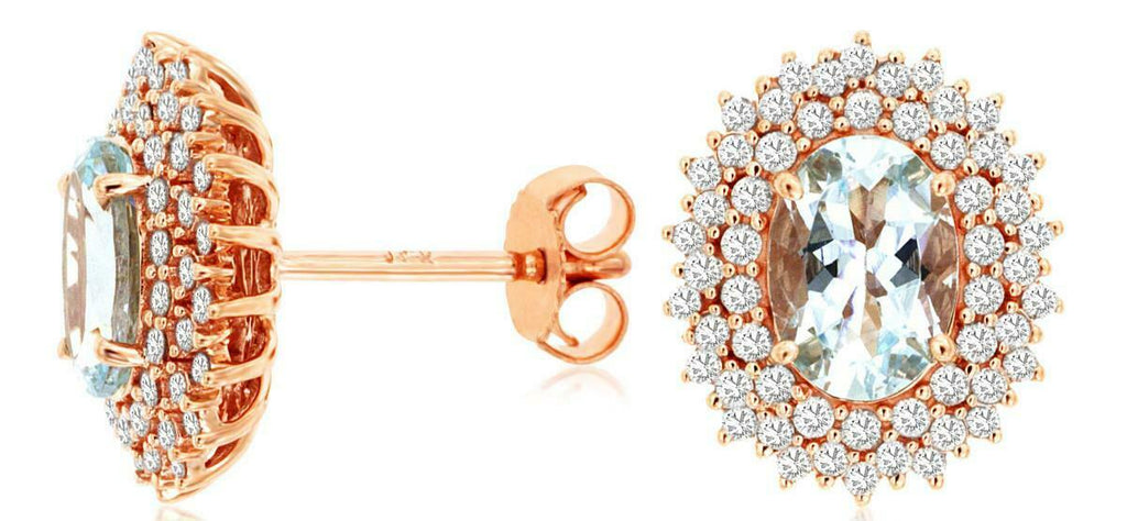 14KT ROSE GOLD STUD EARRINGS. 3D CLASSIC FLOWER DESIGN. ROUND DIAMONDS ARE F/G COLOR, VSSI CLARITY .50 CARATS. AAA OVAL AQUAMARINES ARE 1.35 CARATS. WRITTEN APPRAISAL AVAILABLE. COMES IN A PRESENTABLE GIFT BOX.