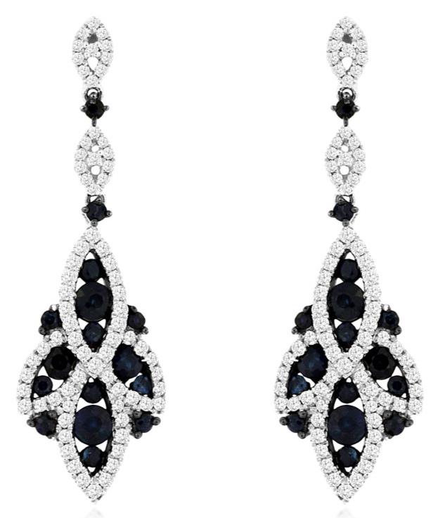 14KT WHITE GOLD FUN HANGING EARRINGS. 3D MULTI LEAF DESIGN. ROUND DIAMONDS ARE F/G COLOR, VSSI CLARITY .64 CARATS. AAA SAPPHIRES ARE 1.25 CARATS. WRITTEN APPRAISAL AVAILABLE. COMES IN A PRESENTABLE GIFT BOX.