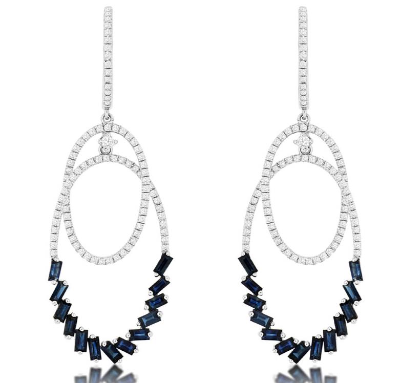 1.8CT DIAMOND & SAPPHIRE 14KT WHITE GOLD ROUND & BAGUETTE OVAL HANGING EARRINGS