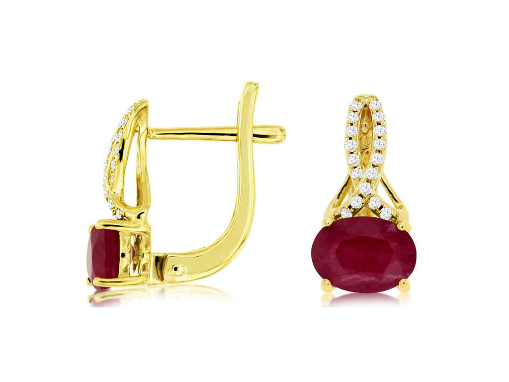14KT YELLOW GOLD LEVERBACK HANGING EARRINGS. 3D SEMI INFINITY DESIGN. ROUND DIAMONDS ARE F/G COLOR, VSSI CLARITY .10 CARATS. AAA OVAL RUBIES ARE 1.80 CARATS. WRITTEN APPRAISAL AVAILABLE. COMES IN A PRESENTABLE GIFT BOX.