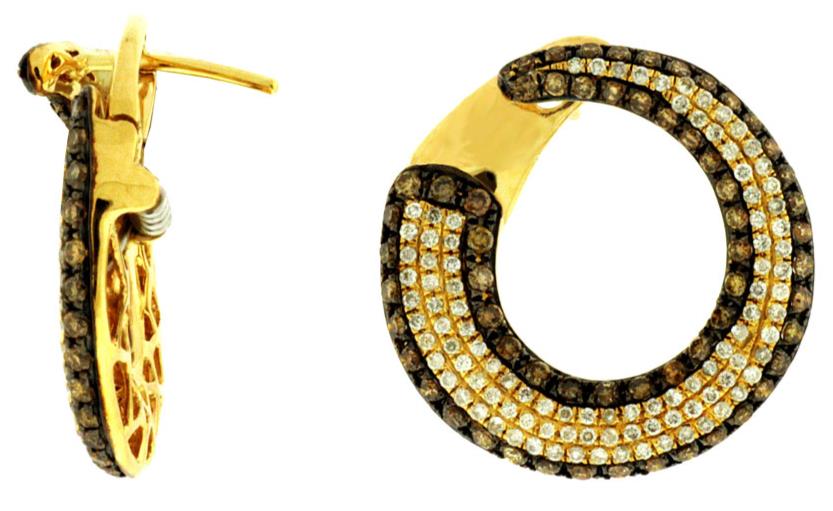 14KT YELLOW GOLD HOOP HANGING EARRINGS. 3D MULTI ROW GRADUATING CIRCULAR SIDEWAY DESIGN. WHITE DIAMONDS ARE F/G COLOR, VSSI CLARITY .62 CARATS. MOCHA DIAMONDS ARE 1.30 CARATS. WRITTEN APPRAISAL AVAILABLE. COMES IN A PRESENTABLE GIFT BOX.
