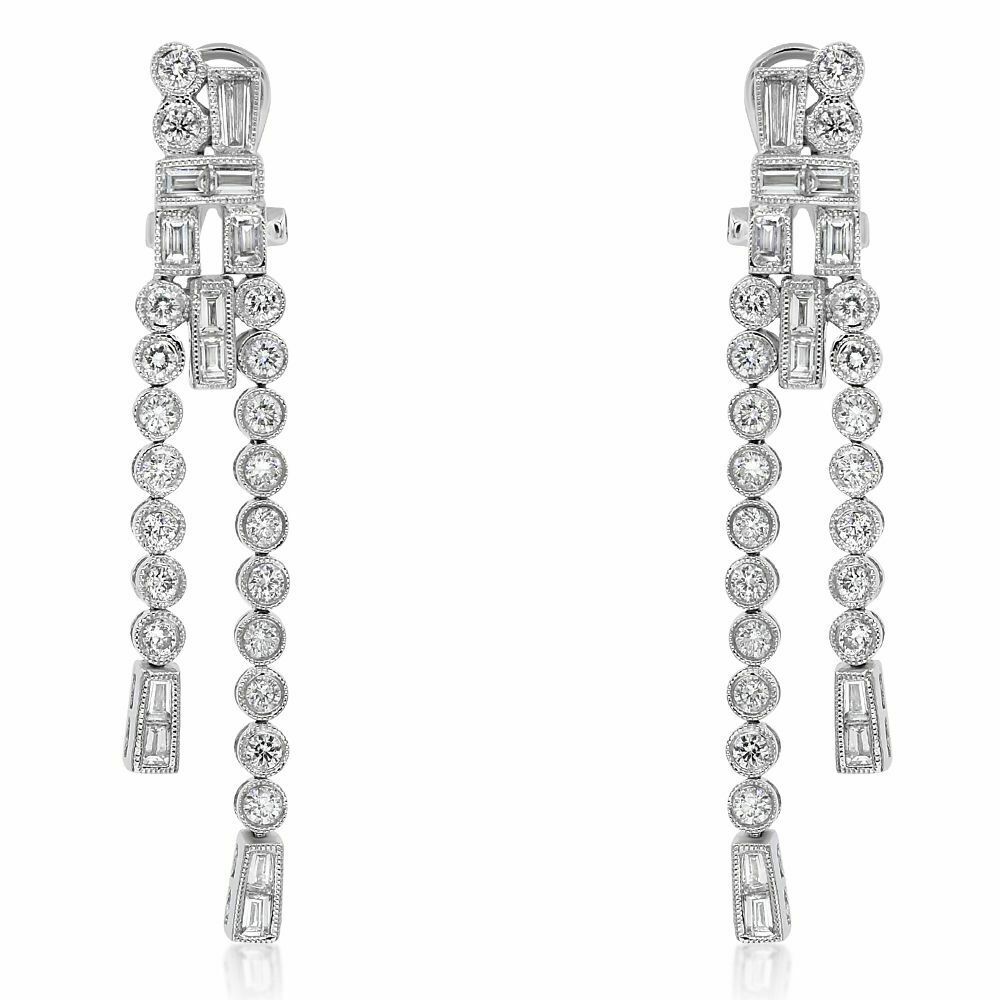 18KT WHITE GOLDHANGING EARRINGS. 3D TWO ROW BEZEL DESIGN. ROUND AND BAGUETTEDIAMONDS ARE F/G COLOR, VSSI CLARITY 1.93 CARATS. WRITTEN APPRAISAL AVAILABLE. COMES IN A PRESENTABLE GIFT BOX.