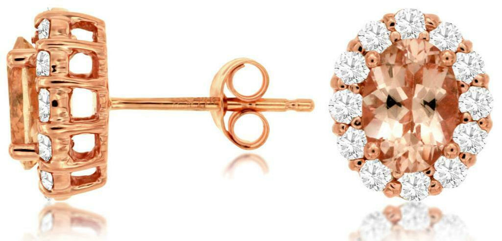 14KT ROSE GOLD STUD EARRINGS. 3D FLOWER CLASSIC DESIGN. ROUND DIAMONDS ARE F/G COLOR, VSSI CLARITY .60 CARATS. AAA OVAL EXTRA FACETED MORGANITES ARE 1.35 CARAT. WRITTEN APPRAISAL AVAILABLE. COMES IN A PRESENTABLE GIFT BOX.