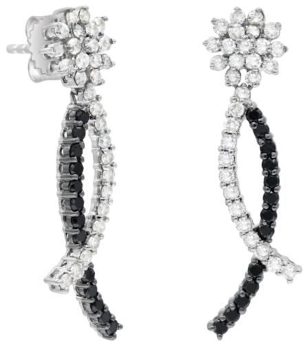 14KT WHITE GOLD LOVE HANGING EARRINGS. 3D FLOWER CRISS CROSS DESIGN. ROUND WHITE DIAMONDS ARE F/G COLOR, VSSI CLARITY 1.34 CARATS. ROUND BLACK DIAMONDS ARE .61 CARATS. WRITTEN APPRAISAL AVAILABLE. COMES IN A PRESENTABLE GIFT BOX.