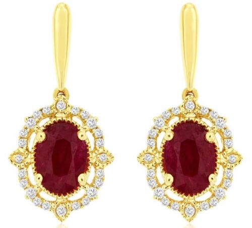 14KT YELLOW GOLD HANGING EARRINGS. 3D FILIGREE FLORAL DESIGN. ROUND DIAMONDS ARE F/G COLOR, VSSI CLARITY .16 CARATS. AAA OVAL RUBIES ARE 1.80 CARATS. WRITTEN APPRAISAL AVAILABLE. COMES IN A PRESENTABLE GIFT BOX.