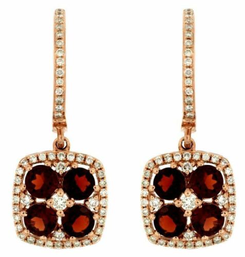 14KT ROSE GOLD HANGING EARRINGS. 3D CLUSTER FLOWER SQUARE HALO DESIGN. DIAMONDS ARE F/G COLOR, VSSI CLARITY .38 CARATS. AAA GARNETS ARE 1.60 CARATS. WRITTEN APPRAISAL AVAILABLE. COMES IN A PRESENTABLE GIFT BOX.