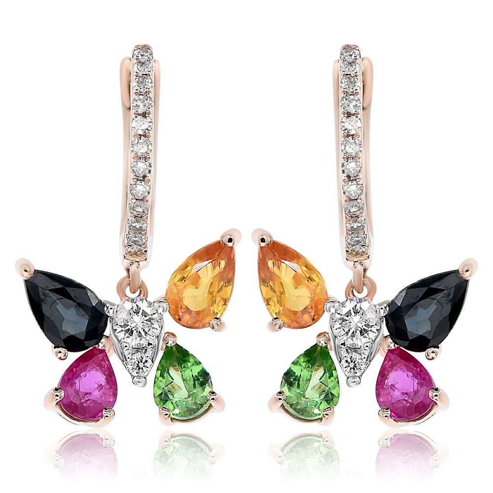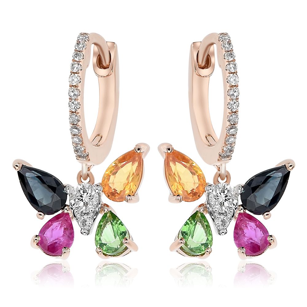 14KT ROSE GOLD HANGING RING. 3D BUTTERFLY LEVERBACK DESIGN. DIAMONDS ARE F/G COLOR, VSSI CLARITY .23 CARATS. AAA MULTI COLOR SAPPHIRES ARE 1.43 CARATS. AAA GREEN GARNET IS .33 CARATS. WRITTEN APPRAISAL AVAILABLE. COMES IN A PRESENTABLE GIFT BOX.