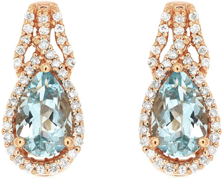 14KT ROSE GOLD HANGING EARRINGS. 3D TEAR DROP DESIGN. ROUND DIAMONDS ARE F/G COLOR, VSSI CLARITY 0.30 CARATS. AAA PEAR SHAPE AQUAMARINES ARE 1.60 CARATS.WRITTEN APPRAISAL AVAILABLE. COMES IN A PRESENTABLE GIFT BOX.