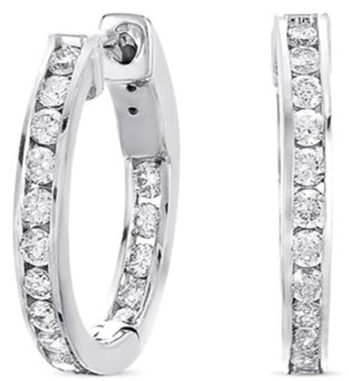 14KT WHITE GOLD HUGGIE HOOP HANGING EARRINGS. 3D CLASSIC CHANNEL INSIDE OUT DESIGN. DIAMONDS ARE F/G COLOR, VSSI CLARITY 1.02 CARATS. MEASURES 3mm WIDE. WRITTEN APPRAISAL AVAILABLE. COMES IN A PRESENTABLE GIFT BOX.