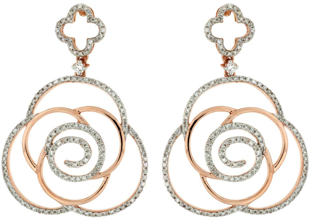14KT ROSE GOLD HANGING EARRINGS. 3D FOUR LEAF CLOVER FLOWER MULTI SWIRL DESIGN. DIAMONDS ARE F/G COLOR, VSSI CLARITY 1.03 CARATS. WRITTEN APPRAISAL AVAILABLE. COMES IN A PRESENTABLE GIFT BOX.