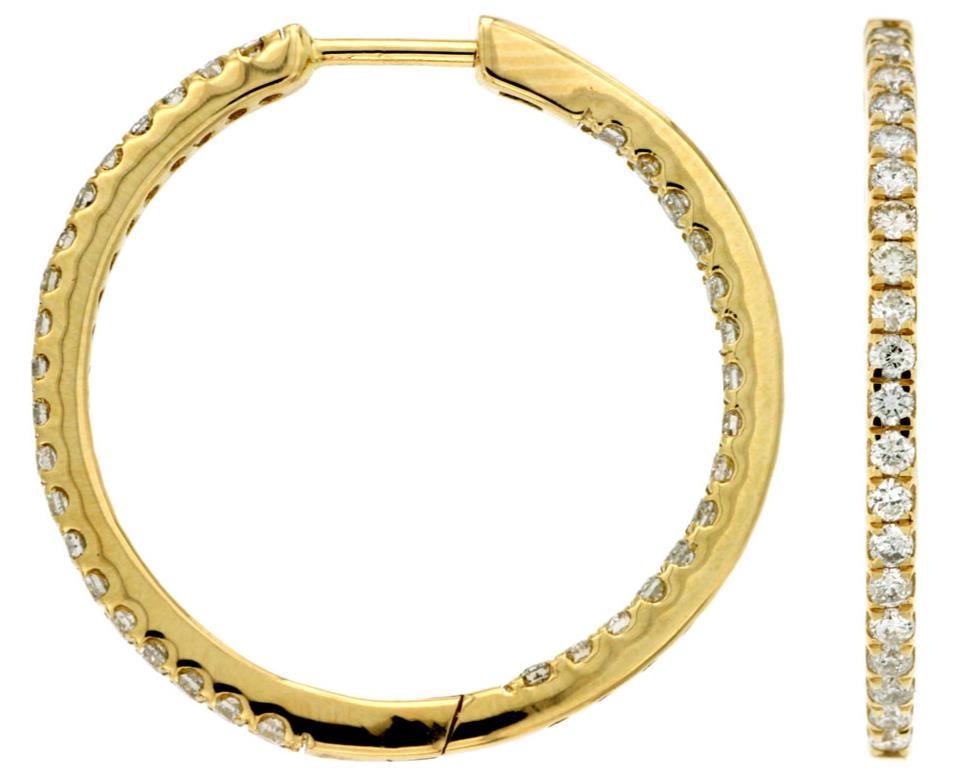 14KT YELLOW GOLD HOOP HANGING EARRINGS. 3D CLASSIC INSIDE OUT DESIGN. DIAMONDS ARE F/G COLOR, VSSI CLARITY 1.04 CARATS. WRITTEN APPRAISAL AVAILABLE. COMES IN A PRESENTABLE GIFT BOX.