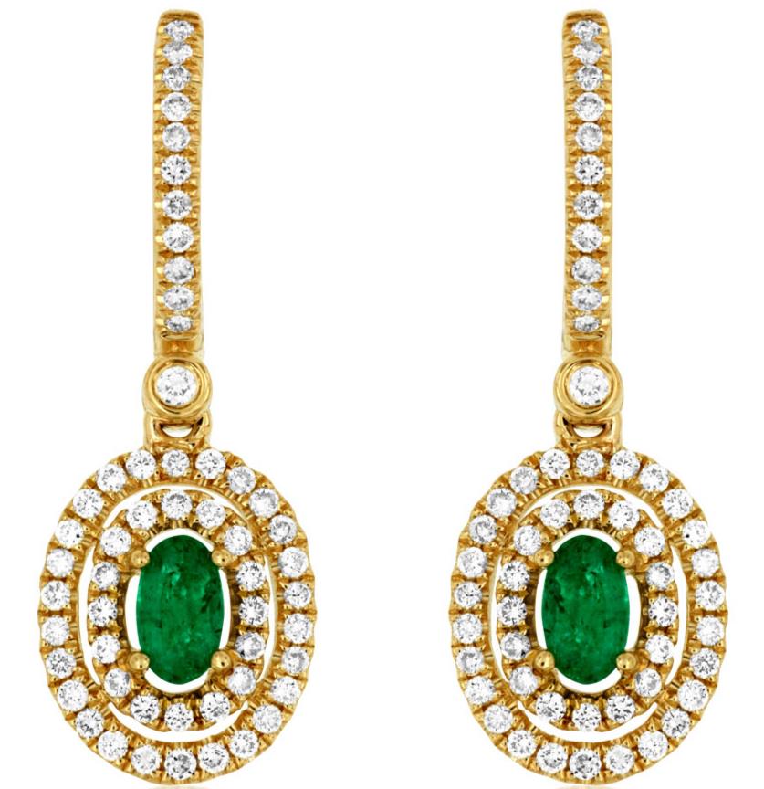 1.05CT DIAMOND & AAA EMERALD 14KT YELLOW GOLD OVAL DOUBLE HALO HANGING EARRINGS