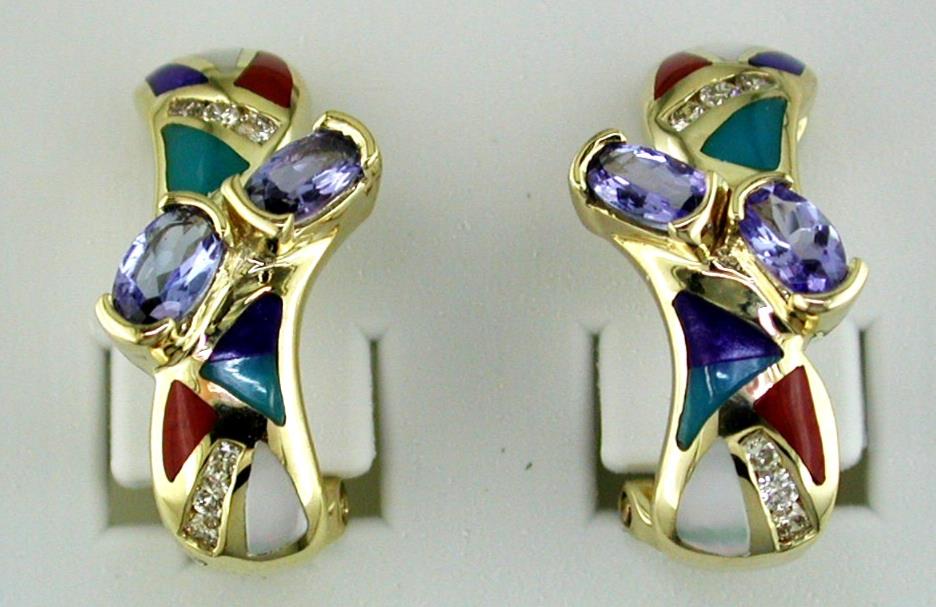 14KT YELLOW GOLD CLIP ON HANGING EARRINGS. 3D CLASSIC DESIGN. ROUND DIAMONDS ARE F/G COLOR, VSSI CLARITY .19 CARATS. AAA OVAL TANZANITES ARE .88 CARATS. FEATURES AAA LAPIS, TURQUOISE, AND AGATE. WRITTEN APPRAISAL AVAILABLE. COMES IN A PRESENTABLE GIFT BOX.