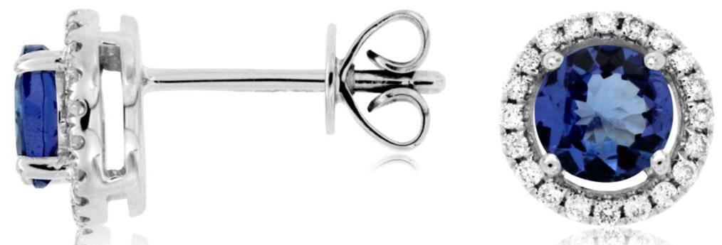 14KT WHITE GOLD STUD EARRINGS. 3D CLASSIC HALO DESIGN. DIAMONDS ARE F/G COLOR, VSSI CLARITY .15 CARATS. AAA ROUND TANZANITES ARE 1.0 CARAT. WRITTEN APPRAISAL AVAILABLE. COMES IN A PRESENTABLE GIFT BOX.