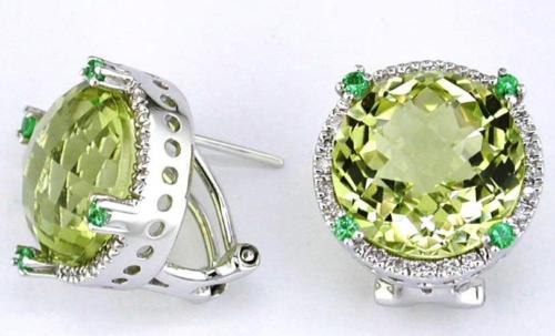 14KT WHITE GOLD CLIP ON EARRINGS. 3D ROUND FILIGREE DESIGN. DIAMONDS ARE F/G COLOR, VSSI CLARITY .16 CARATS. AAA EMERALDS AND EXTRA FACETED LEMON QUARTZ ARE 12.50 CARATS. WRITTEN APPRAISAL AVAILABLE. COMES IN A PRESENTABLE GIFT BOX.
