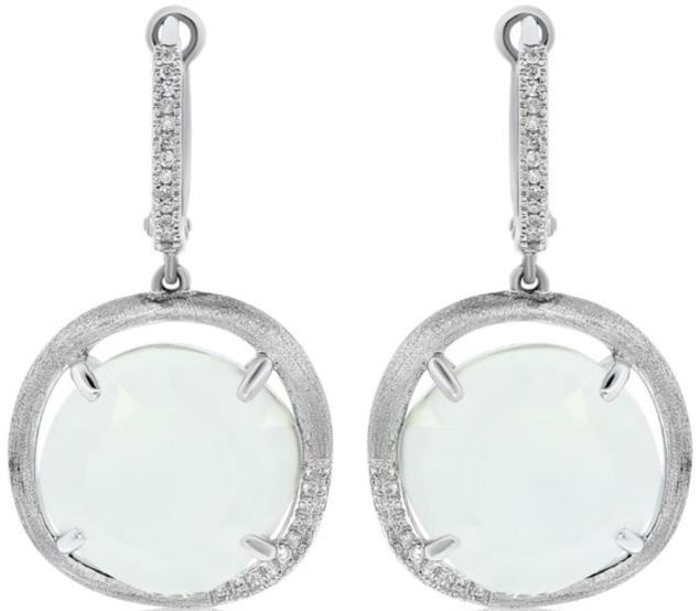 14KT WHITEGOLD HANGING EARRINGS. 3D ROUND MATTE AND SHINYDESIGN. DIAMONDS ARE F/G COLOR, VSSI CLARITY .21 CARATS.AAA GREEN AMETHYSTS ARE 12.46 CARATS. WRITTEN APPRAISAL AVAILABLE. COMES IN A PRESENTABLE GIFT BOX.