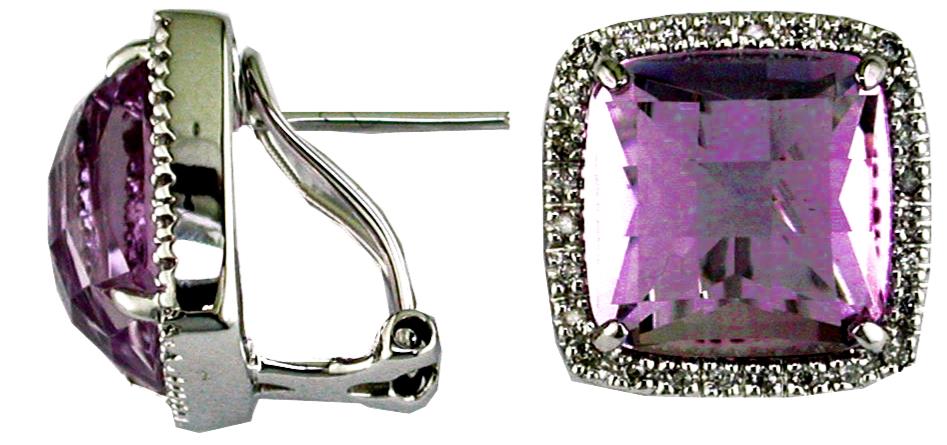 14KT WHITE GOLD CLIP ON EARRINGS. 3D CLASSIC SQUARE HALO DESIGN. DIAMONDS ARE F/G COLOR, VSSI CLARITY .22 CARATS. AAA EXTRA FACETED AMETHYSTS ARE 12.0 CARATS. WRITTEN APPRAISAL AVAILABLE. COMES IN A PRESENTABLE GIFT BOX.