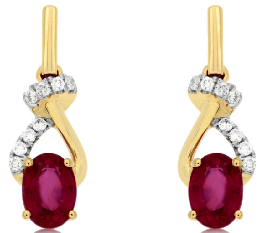 14KT YELLOW GOLD HANGING EARRINGS. 3D LOVE KNOT TEAR DROP DESIGN. ROUND DIAMONDS ARE F/G COLOR, VSSI CLARITY .10 CARATS. AAA OVAL RUBIES ARE 1.10 CARATS. WRITTEN APPRAISAL AVAILABLE. COMES IN A PRESENTABLE GIFT BOX.