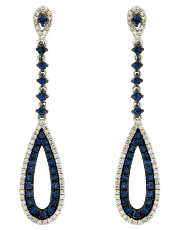 14KT WHITE GOLD HANGING EARRINGS. 3D ELONGATED OPEN TEAR DROP DESIGN. DIAMONDS ARE F/G COLOR, VSSI CLARITY .34 CARATS. AAA SAPPHIRES ARE .88 CARATS. WRITTEN APPRAISAL AVAILABLE. COMES IN A PRESENTABLE GIFT BOX.