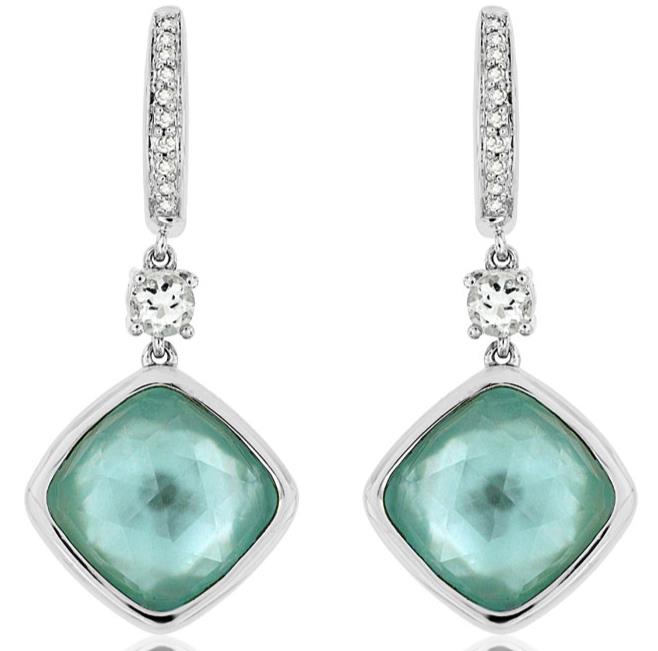 14KT WHITE GOLD FUN HANGING EARRINGS. 3D SQUARE GEOMETRICAL DESIGN. ROUND DIAMONDS ARE F/G COLOR, VSSI CLARITY .08 CARATS. AAA EXTRA FACETED CUSHION CUT BLUE TOPAZ ARE 13.0 CARATS. WRITTEN APPRAISAL AVAILABLE. COMES IN A PRESENTABLE GIFT BOX.