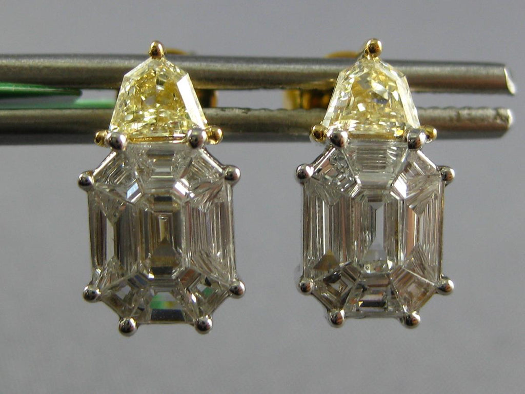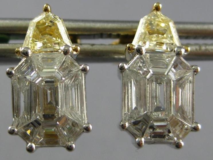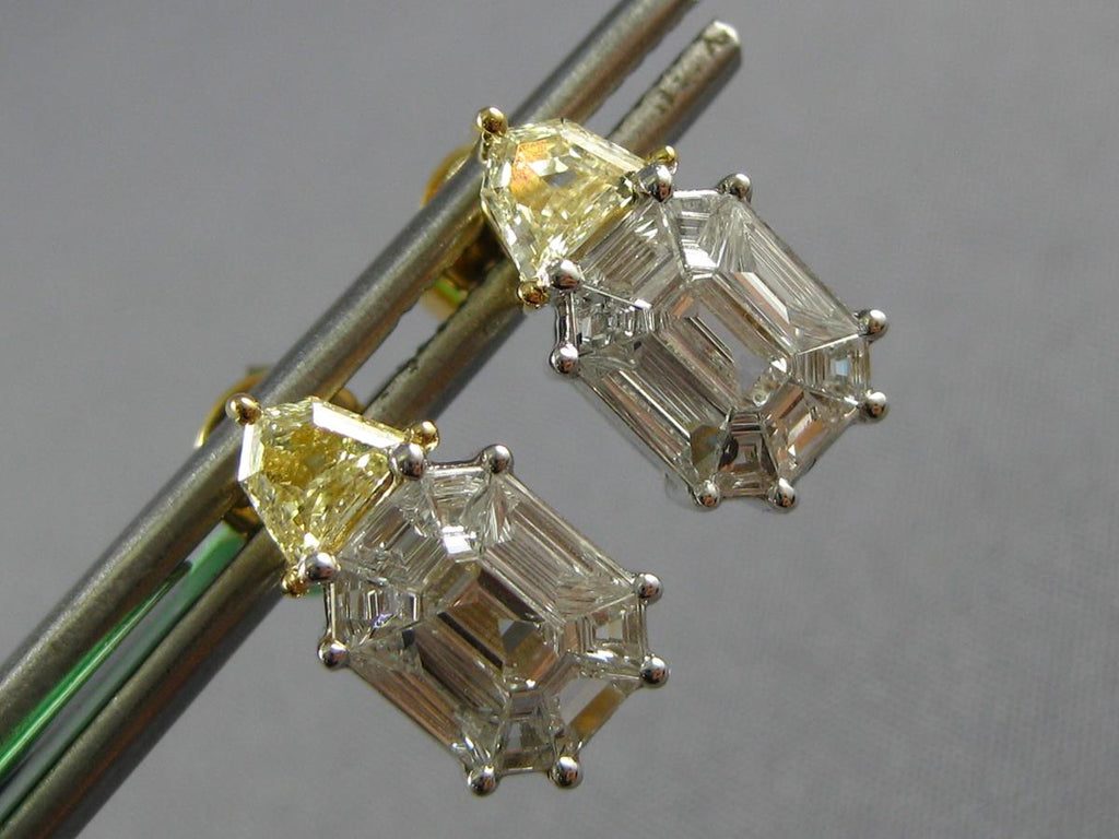 18KT WHITE AND YELLOW GOLD STUD EARRINGS. 3D SQUARE DESIGN. WHITE DIAMONDS ARE F/G COLOR, VS CLARITY. BAGUETTE WHITE AND KITE CUT CANARY DIAMONDS ARE 1.30 CARATS. MEASURES 12mm X 6mm. WRITTEN APPRAISAL AVAILABLE. COMES IN A PRESENTABLE GIFT BOX.