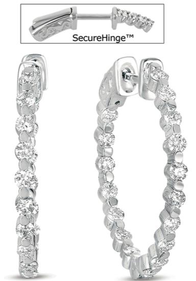 14KT WHITE GOLD HOOP HANGING EARRINGS. 3D CLASSIC SHARED PRONG INSIDE OUT DESIGN. DIAMONDS ARE F/G COLOR, VSSI CLARITY 1.44 CARATS. WRITTEN APPRAISAL AVAILABLE. COMES IN A PRESENTABLE GIFT BOX.