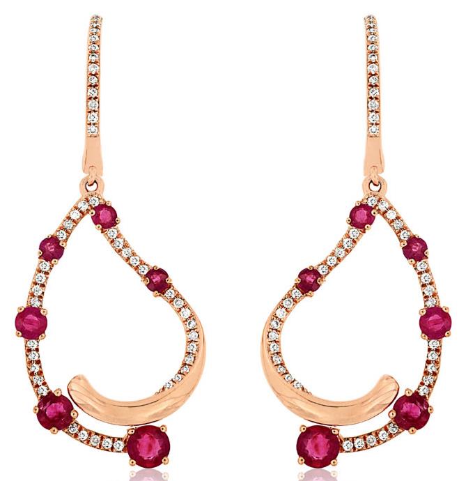 14KT ROSE GOLD HANGING EARRINGS. 3D DOUBLE HEART DESIGN. DIAMONDS ARE F/G COLOR, VSSI CLARITY .27 CARATS. AAA RUBY IS 1.17 CARATS. WRITTEN APPRAISAL AVAILABLE. COMES IN A PRESENTABLE GIFT BOX.