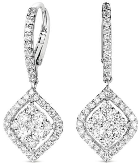 14KT WHITE GOLD LEVERBACK HANGING EARRINGS. 3D CLASSIC CLUSTER TEAR DROP DESIGN. ROUND DIAMONDS ARE F/G COLOR, VSSI CLARITY 1.47 CARATS. WRITTEN APPRAISAL AVAILABLE. COMES IN A PRESENTABLE GIFT BOX.
