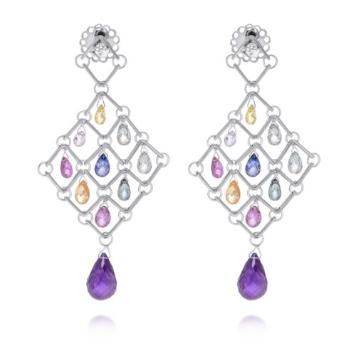 18KT WHITE GOLD HANGING EARRINGS. 3D GEOMETRICAL TEAR DROP CHANDELIER DESIGN. DIAMONDS ARE F/G COLOR, VSSI CLARITY .23 CARATS. AAA MULTI COLORED SAPPHIRES ARE 16.50 CARATS. DROP MEASURES 85mm. WRITTEN APPRAISAL AVAILABLE. COMES IN A PRESENTABLE GIFT BOX.