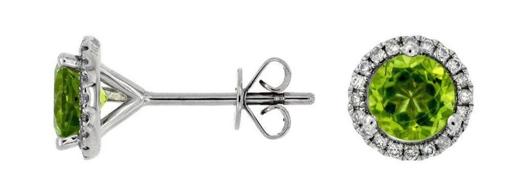 14KT WHITE GOLD STUD EARRINGS. 3D CLASSIC HALO MARTINI DESIGN. DIAMONDS ARE F/G COLOR, VSSI CLARITY .16 CARATS. AAA EXTRA FACETED ROUND PERIDOT IS 1.50 CARATS. WRITTEN APPRAISAL AVAILABLE. COMES IN A PRESENTABLE GIFT BOX.