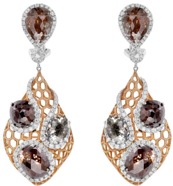 17.49CT WHITE & MOCHA DIAMOND 18KT 2 TONE GOLD 3D MULTI SHAPE HANGING EARRINGS