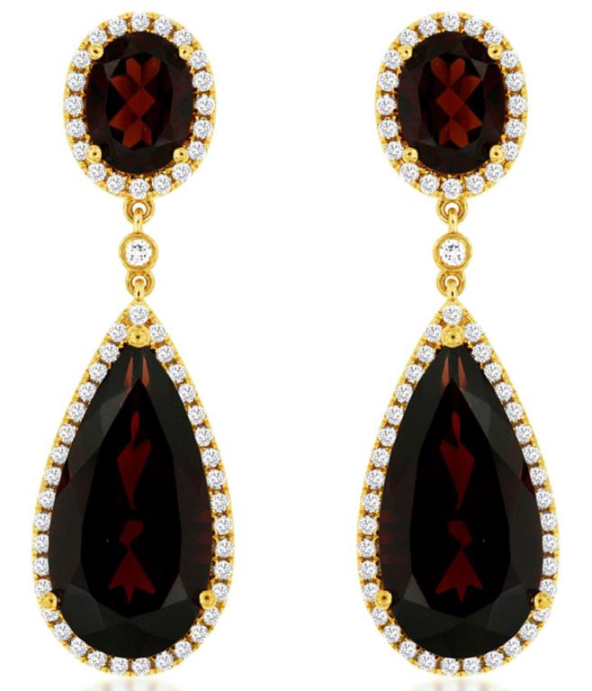 14KT YELLOW GOLD HANGING EARRINGS. 3D TEAR DROP DESIGN. ROUND DIAMONDS ARE F/G COLOR, VSSI CLARITY 0.75 CARATS. AAA EXTRA FACETED PEAR SHAPE GARNETS ARE 17.00 CARATS. WRITTEN APPRAISAL AVAILABLE. COMES IN A PRESENTABLE GIFT BOX.