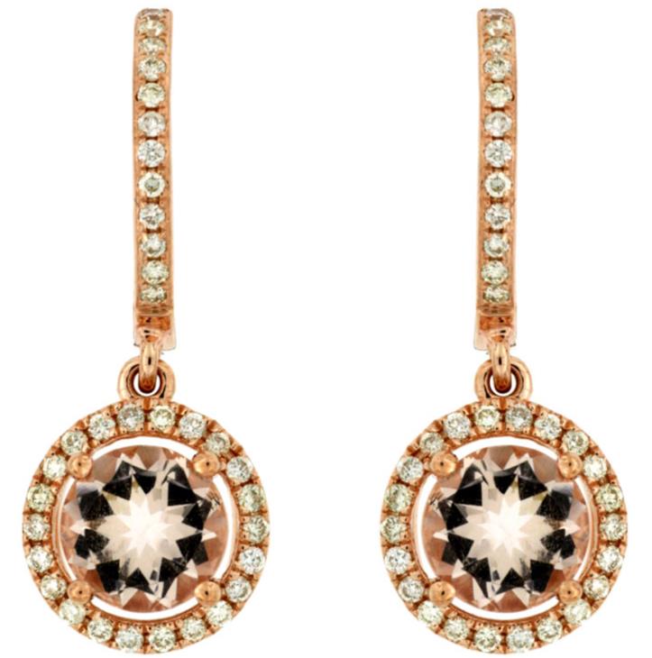 14KT ROSE GOLD LEVERBACK HANGING EARRINGS. 3D ROUND HALO CLASSIC DESIGN. DIAMONDS ARE F/G COLOR, VSSI CLARITY .26 CARATS. AAA EXTRA FACETED MORGANITES ARE 1.45 CARATS. WRITTEN APPRAISAL AVAILABLE. COMES IN A PRESENTABLE GIFT BOX.