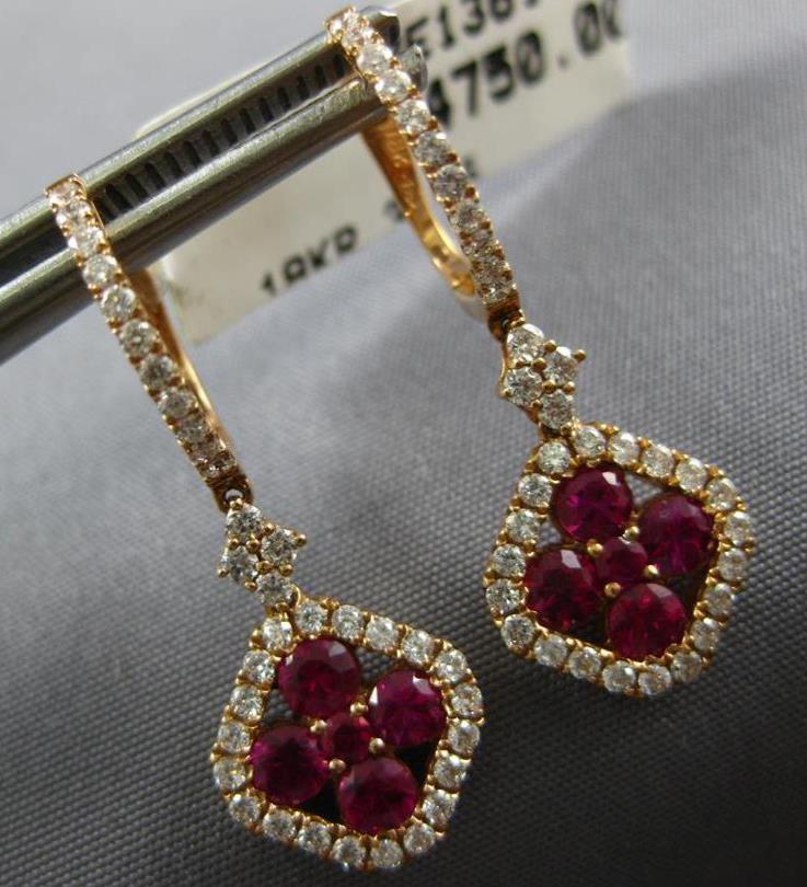 18KT ROSE GOLD LEVERBACK HANGING EARRINGS. 3D FLOWER SQUARE2 DESIGN. DIAMONDS ARE F/G COLOR, VSSI CLARITY .58 CARATS. AAA ROUND RUBIES ARE 1.16 CARATS. MEASURES 26mm X 10mm. WRITTEN APPRAISAL AVAILABLE. COMES IN A PRESENTABLE GIFT BOX.