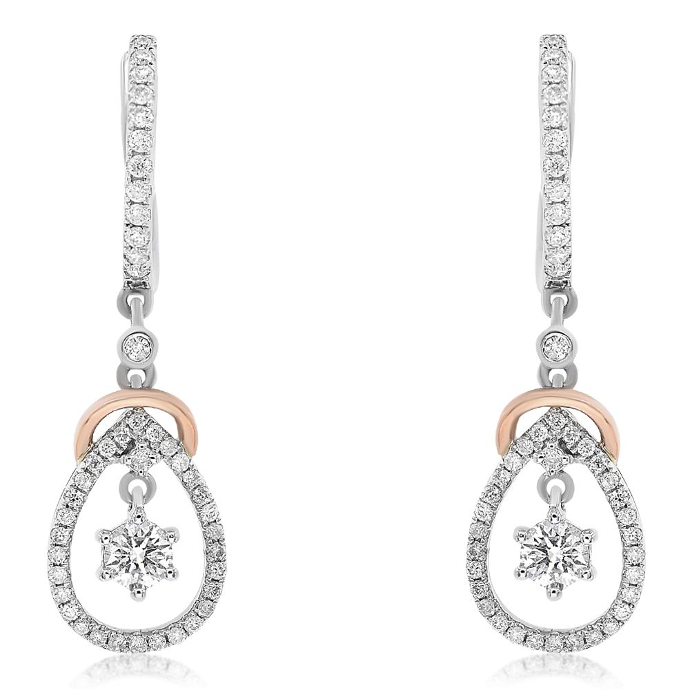 14KT WHITE AND ROSE GOLD FUN HANGING EARRINGS. 3D SOLITAIRE TEAR DROP DESIGN. DIAMONDS ARE F/G COLOR, VSSI CLARITY. CENTER DIAMONDS ARE .45 CARATS. SIDE DIAMONDS ARE .46 CARATS. WRITTEN APPRAISAL AVAILABLE. COMES IN A PRESENTABLE GIFT BOX.