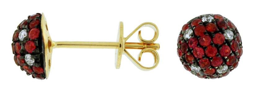 14KT YELLOW GOLD STUD EARRINGS. 3D CIRCULAR DOME SHAPE CLASSIC DESIGN. DIAMONDS ARE F/G COLOR, VSSI CLARITY .12 CARATS. AAA RUBIES ARE .88 CARATS. WRITTEN APPRAISAL AVAILABLE. COMES IN A PRESENTABLE GIFT BOX.