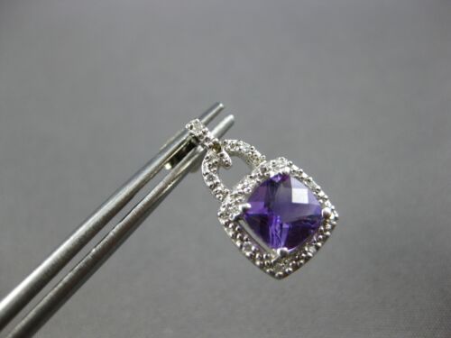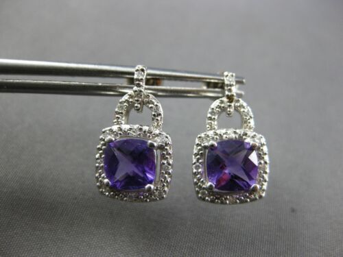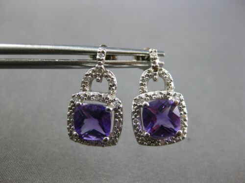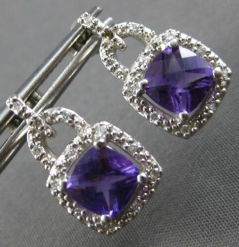 14KT WHITE GOLD HANGING EARRINGS. 3D SQUARE HALO LOVE KNOT DESIGN. ROUND DIAMONDS ARE F/G COLOR, VSSI CLARITY .12 CARATS. AAA EXTRA FACETED CUSHION CUT AMETHYSTS ARE 1.90 CARATS. MEASURES 17mm X 10mm. WRITTEN APPRAISAL AVAILABLE. COMES IN A PRESENTABLE GIFT BOX.