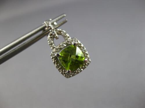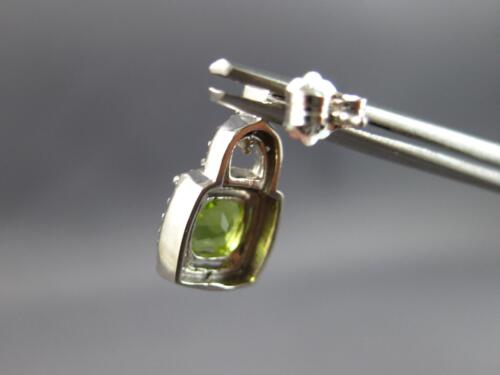 14KT WHITE GOLD HANGING EARRINGS. 3D SQUARE HALO LOVE KNOT DESIGN. ROUND DIAMONDS ARE F/G COLOR, VSSI CLARITY .12 CARATS. AAA EXTRA FACETED CUSHION CUT PERIDOTS ARE 1.90 CARATS. MEASURES 16.5mm X 9mm. WRITTEN APPRAISAL AVAILABLE. COMES IN A PRESENTABLE GIFT BOX.