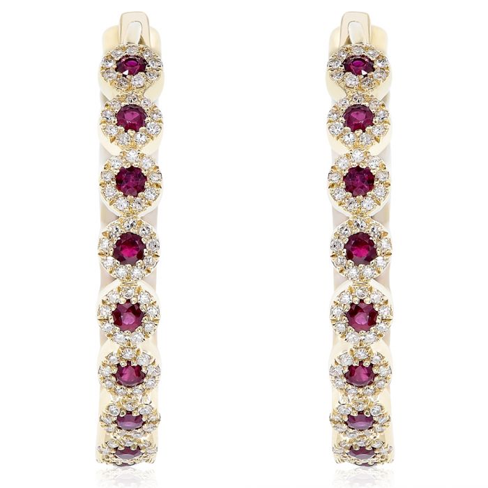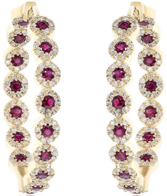 14KT YELLOW GOLD HOOP HANGING EARRINGS. 3D MULTI FLOWER DESIGN. DIAMONDS ARE F/G COLOR, VSSI CLARITY .76 CARATS. AAA RUBIES ARE 1.26 CARATS. WRITTEN APPRAISAL AVAILABLE. COMES IN A PRESENTABLE GIFT BOX.