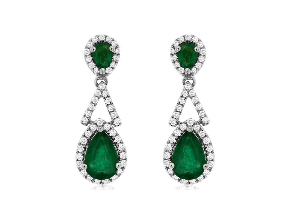14KT WHITE GOLD HANGING EARRINGS. 3D CLASSIC DESIGN. ROUND DIAMONDS ARE F/G COLOR, VSSI CLARITY .39 CARATS. AAA PEAR SHAPE EMERALDS ARE 1.64 CARATS. WRITTEN APPRAISAL AVAILABLE. COMES IN A PRESENTABLE GIFT BOX.