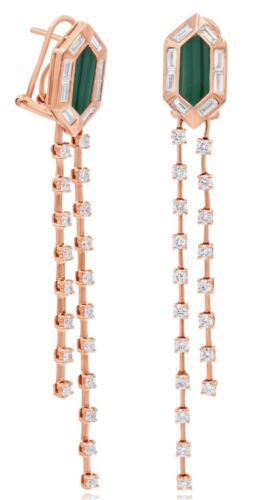 14KT ROSE GOLD CLIP ON HANGING EARRINGS. 3D HEXAGON BY THE YARD DESIGN. DIAMONDS ARE F/G COLOR, VSSI CLARITY. ROUND DIAMONDS ARE 1.32 CARATS. BAGUETTE DIAMONDS ARE .74 CARATS. FEATURES AAA AGATE.
